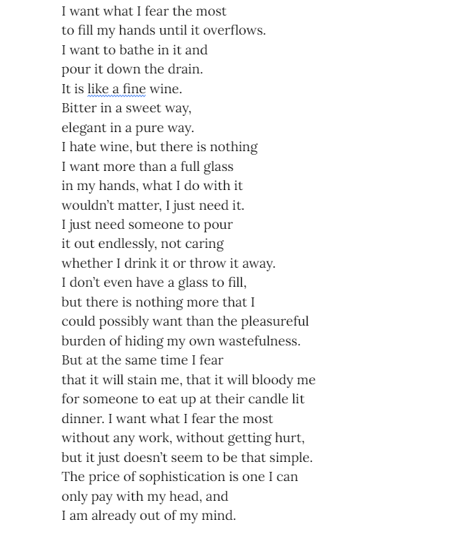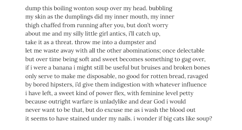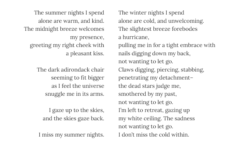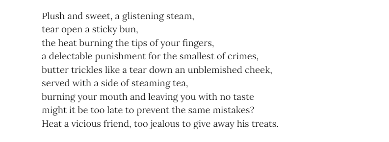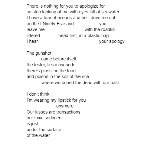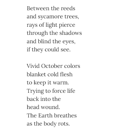 Kate Bucek - is an East Asian Studies major with minors in Korean Studies and Creative Writing. She takes inspiration from the various ways people are connected to each other around the world, as well as the unique flows and rhythms present in different languages, since she knows English, Korean, and Spanish. While her main focus is poetry, she also works in short fiction when inspiration strikes. In 2021, she earned honorable mentions in the Scholastic Writing Contest for two of her short stories.