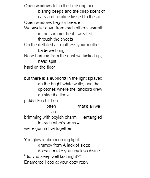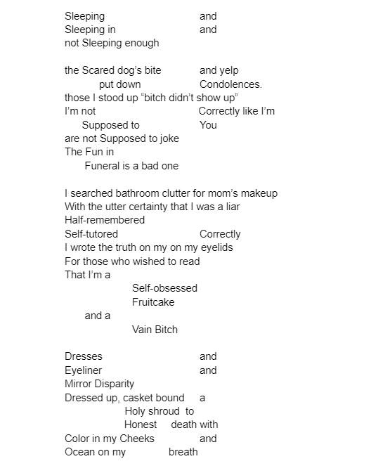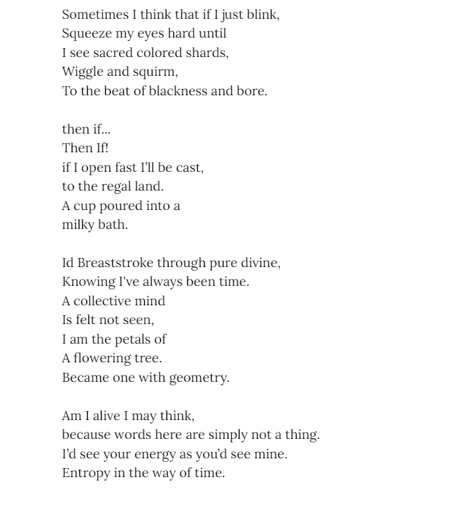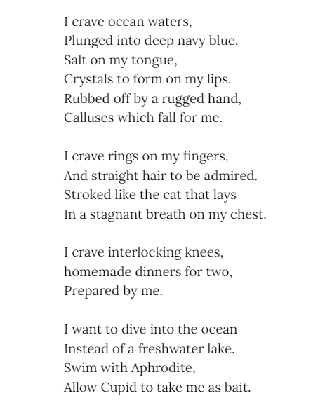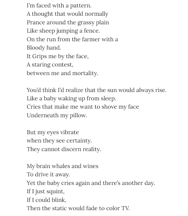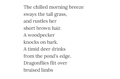 Morgan Lynn - has been writing for fun since she was young, beginning at 12 with an Instagram account dedicated to sims fan fiction. Besides her love for writing she studies Biology with an interest in evolution. Morgan likes to illicit an uncomfortable feeling from her fiction and poetry, she pulls inspiration from classic novels.